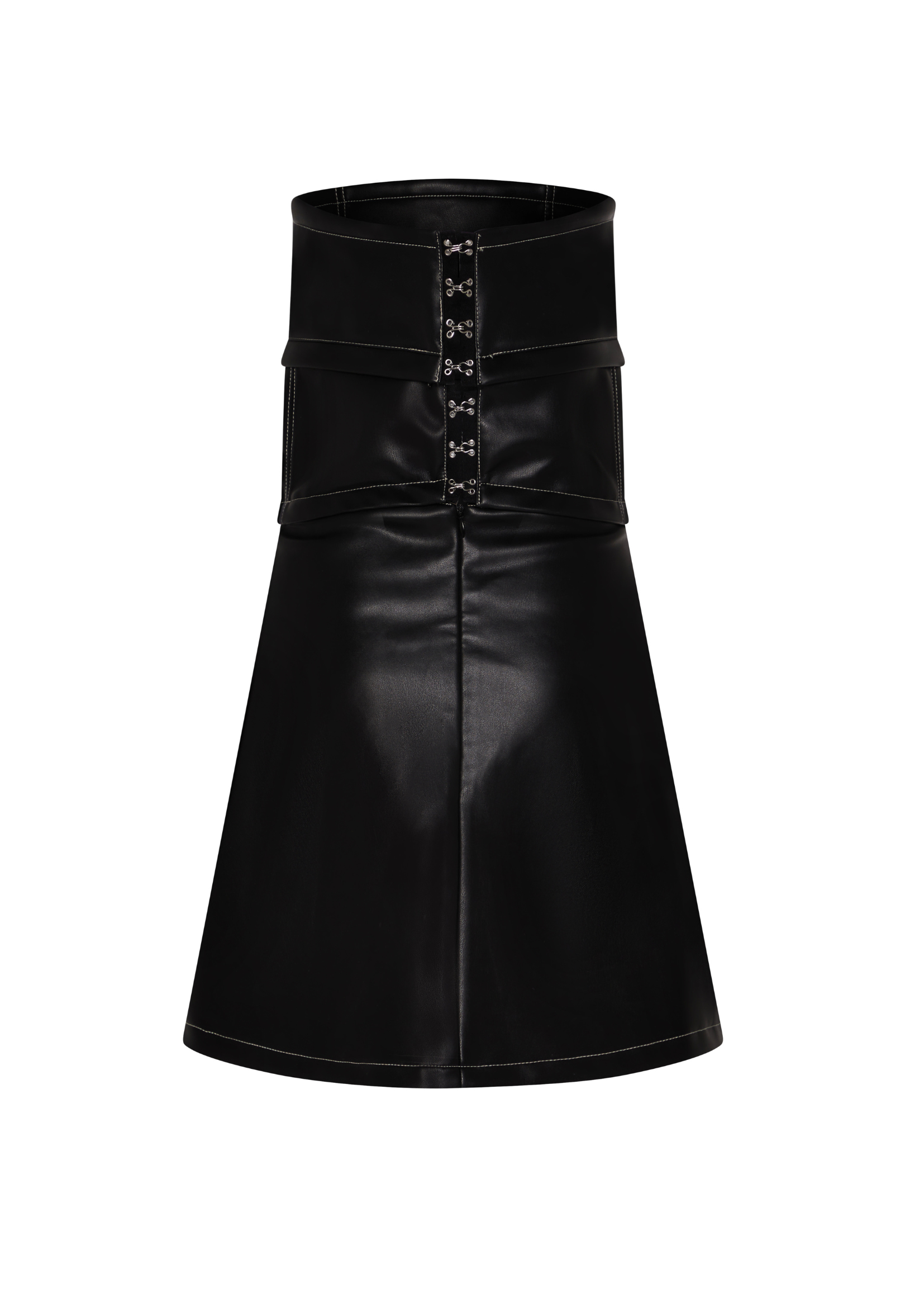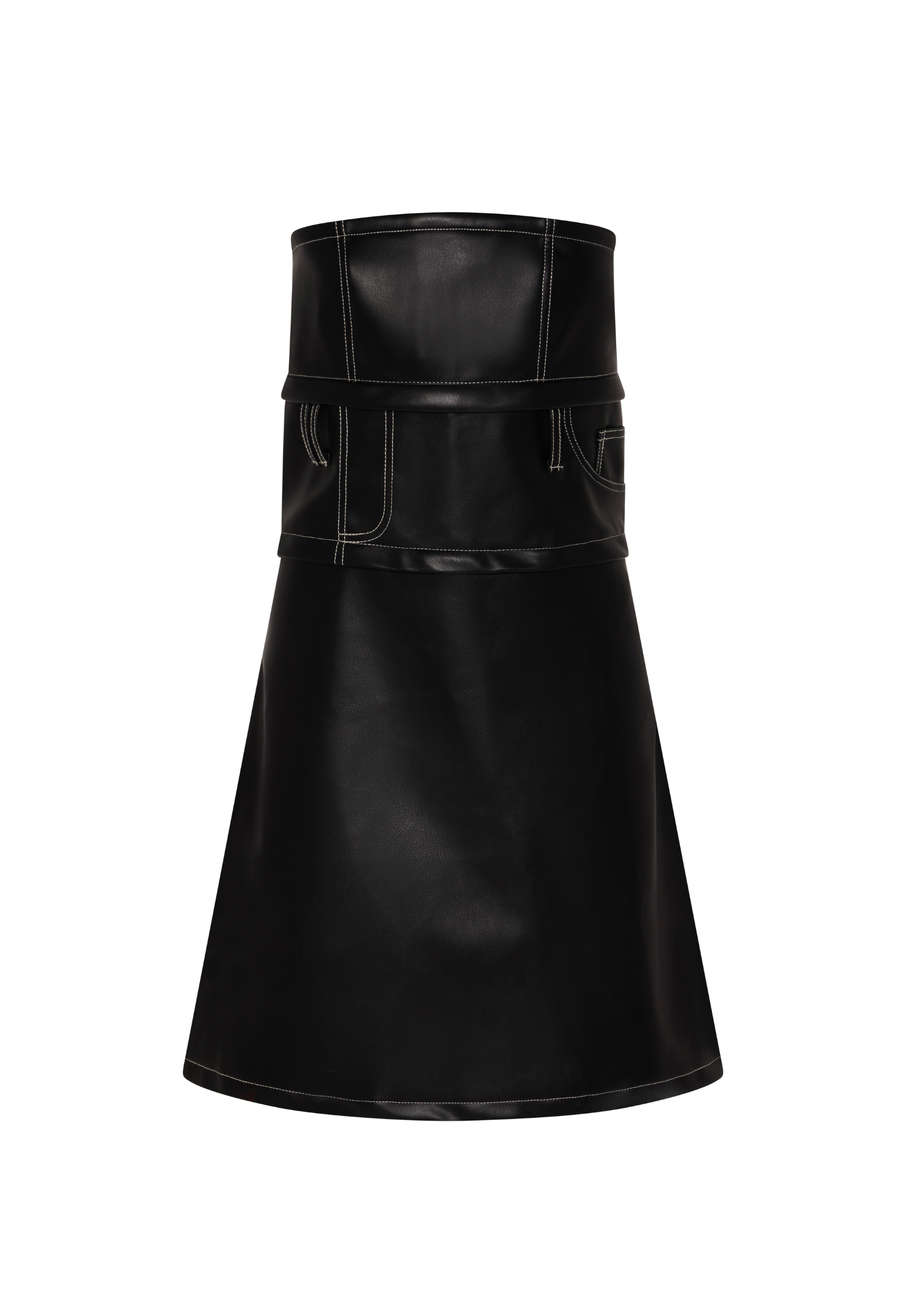FAUX LEATHER MODULAR STRAPLESS DRESS. CAN BE WORN MANY DIFFERENT WAYS AS A TOP, BANDEAU, SKIRT, MIDI DRESS & MINI DRESS. BLACK WITH WHITE CONTRAST STITCHING. ALL SECTIONS DETACHABLE WITH ZIPS