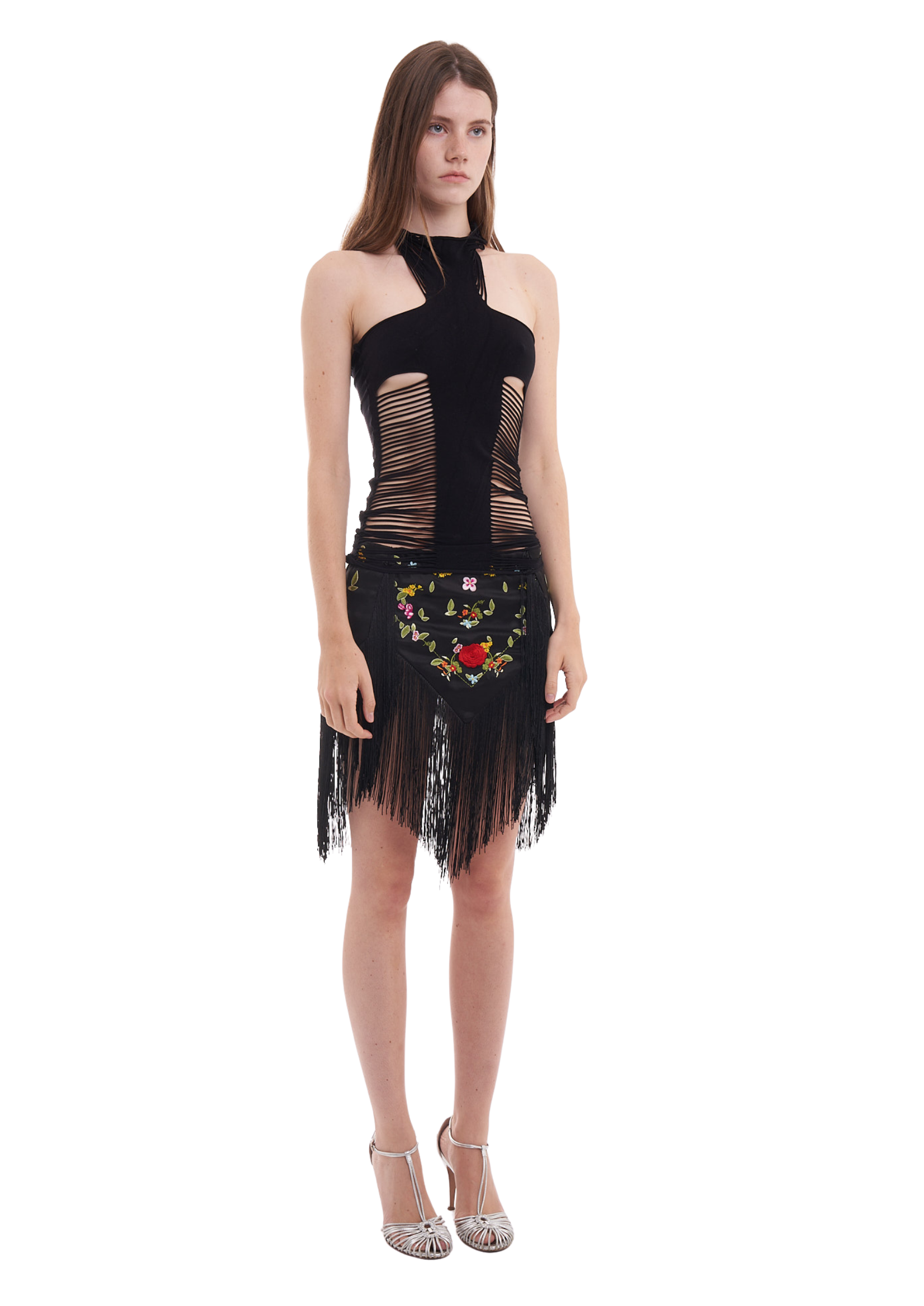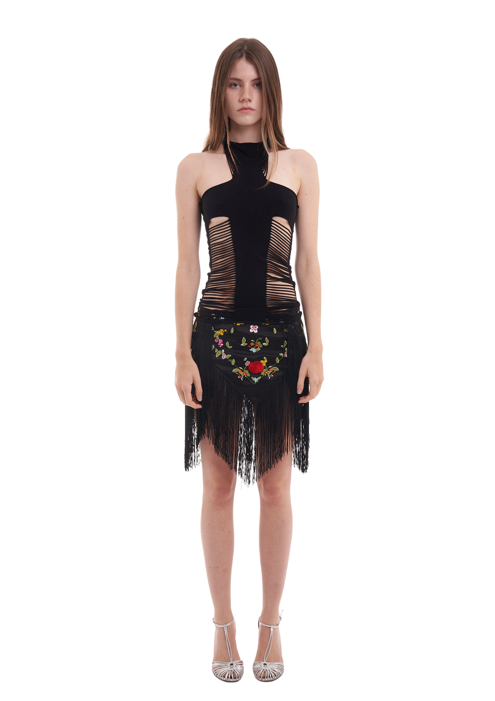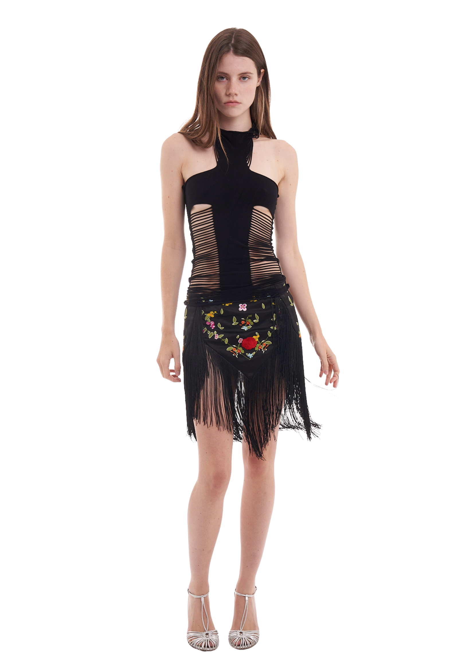 A BLACK SATIN WRAP SKIRT EMBROIDERED WITH INFLUENCE FROM THE MANTONCILLOS SHAWL FUSED WITH NH DETAILING. ADDITIONALLY FEATURING A FRINGE HEM, LOW WAIST FIT & CENTRE BACK ZIP