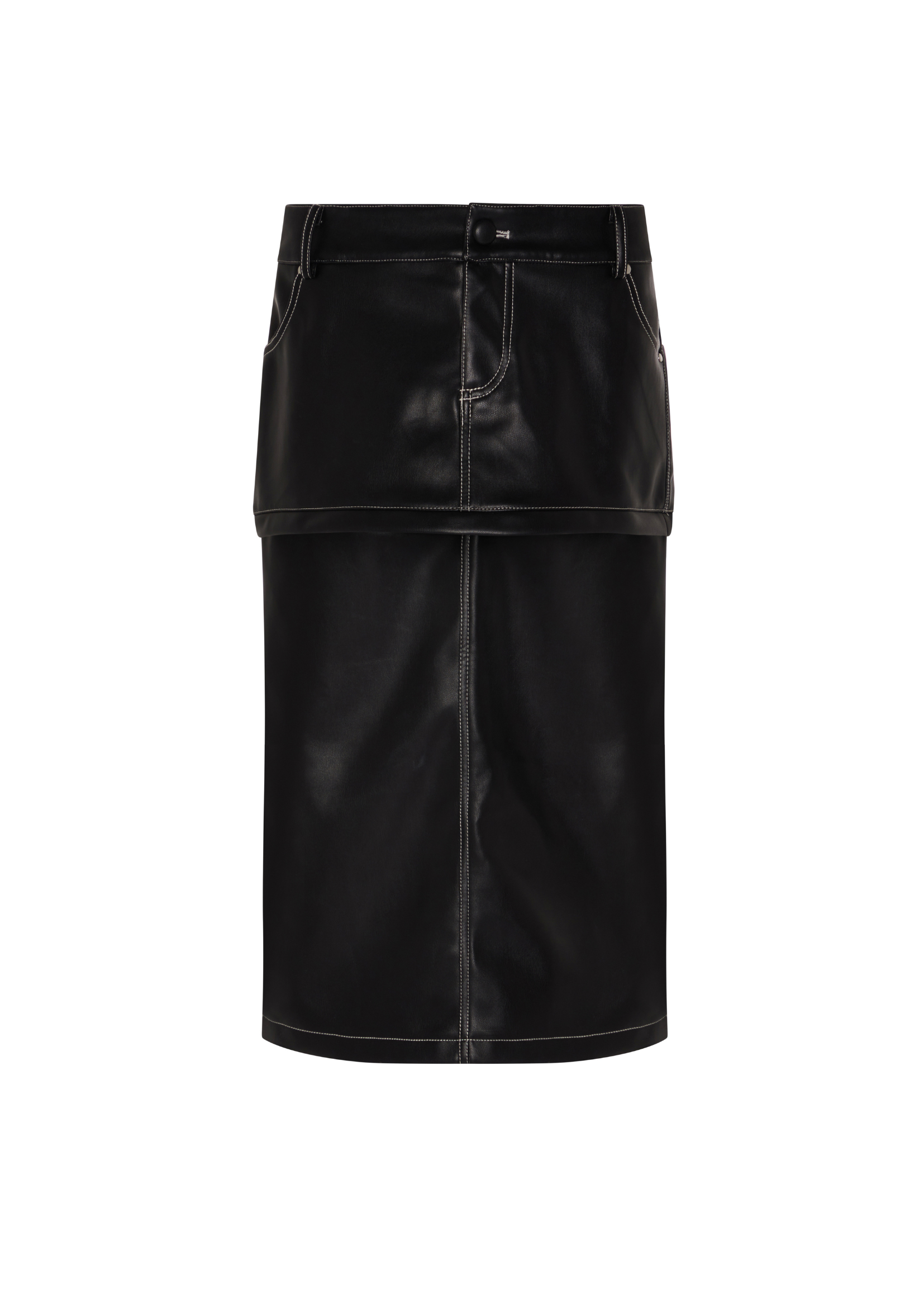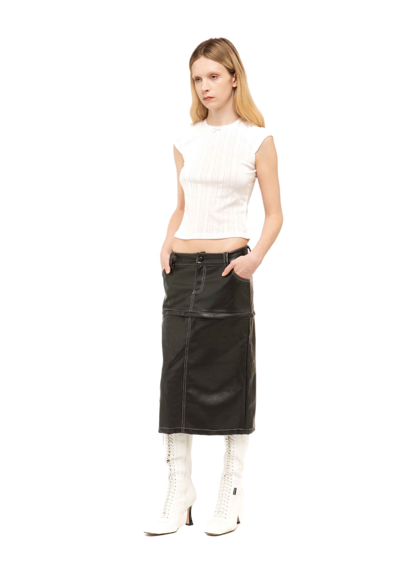 LEATHER SKIRT. BLACK WITH WHITE CONTRAST STITCHING. LOW WAISTED, MIDI SKIRT