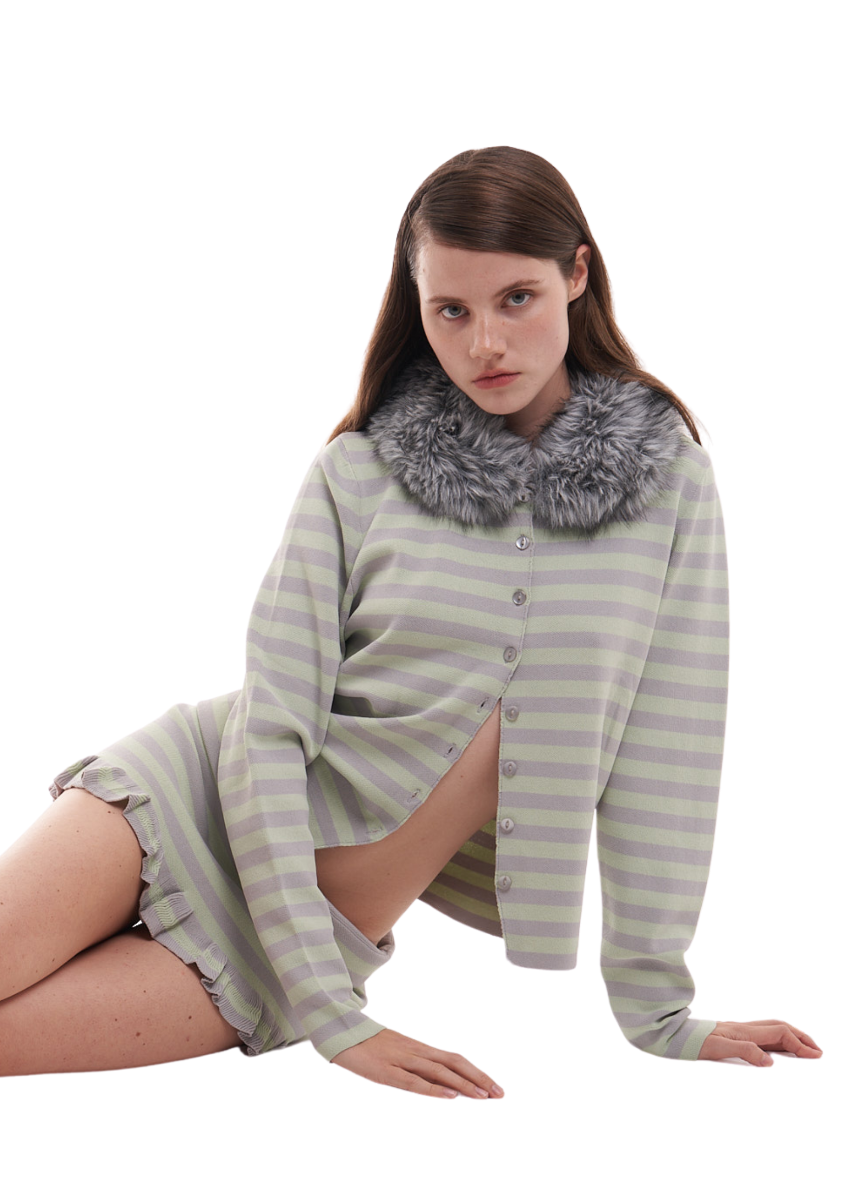 MINT GREEN & GREY BUTTON UP LOOSE BOXY FIT CARDIGAN. FEATURING A DETACHABLE FUR COLLAR THAT CAN BE WORN SEPARATELY