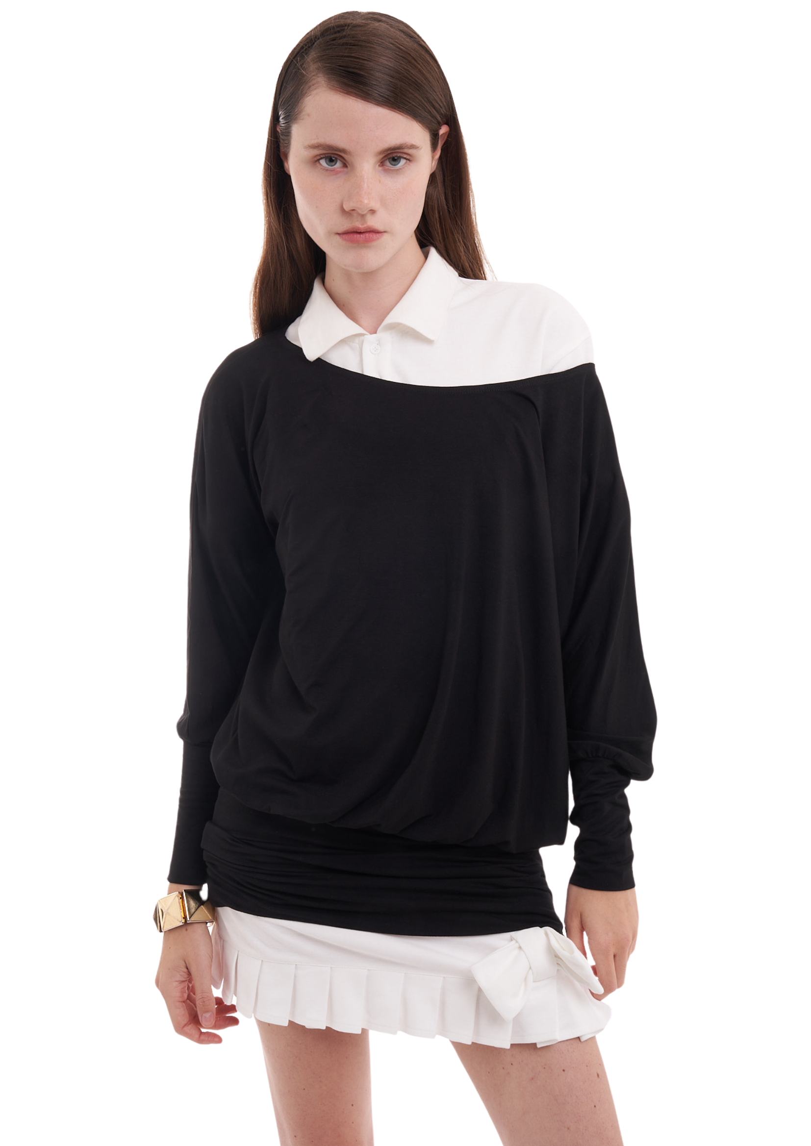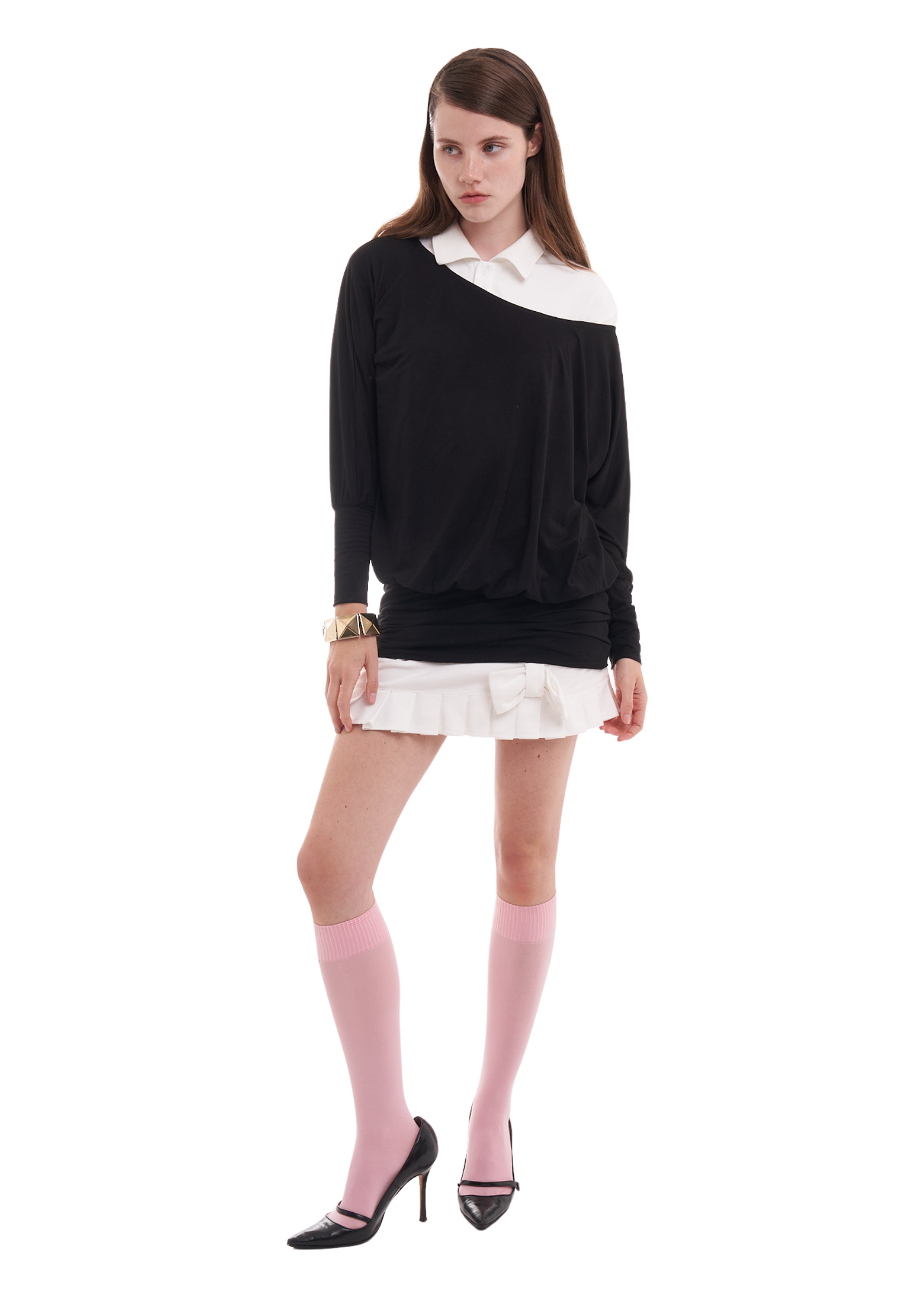 OFF THE SHOULDER BATWING DRESS IN CHARCOAL BLACK. FINISHED WITH A MINI BOW & METAL HEART ENGRAVED WITH ‘NIIHAI’