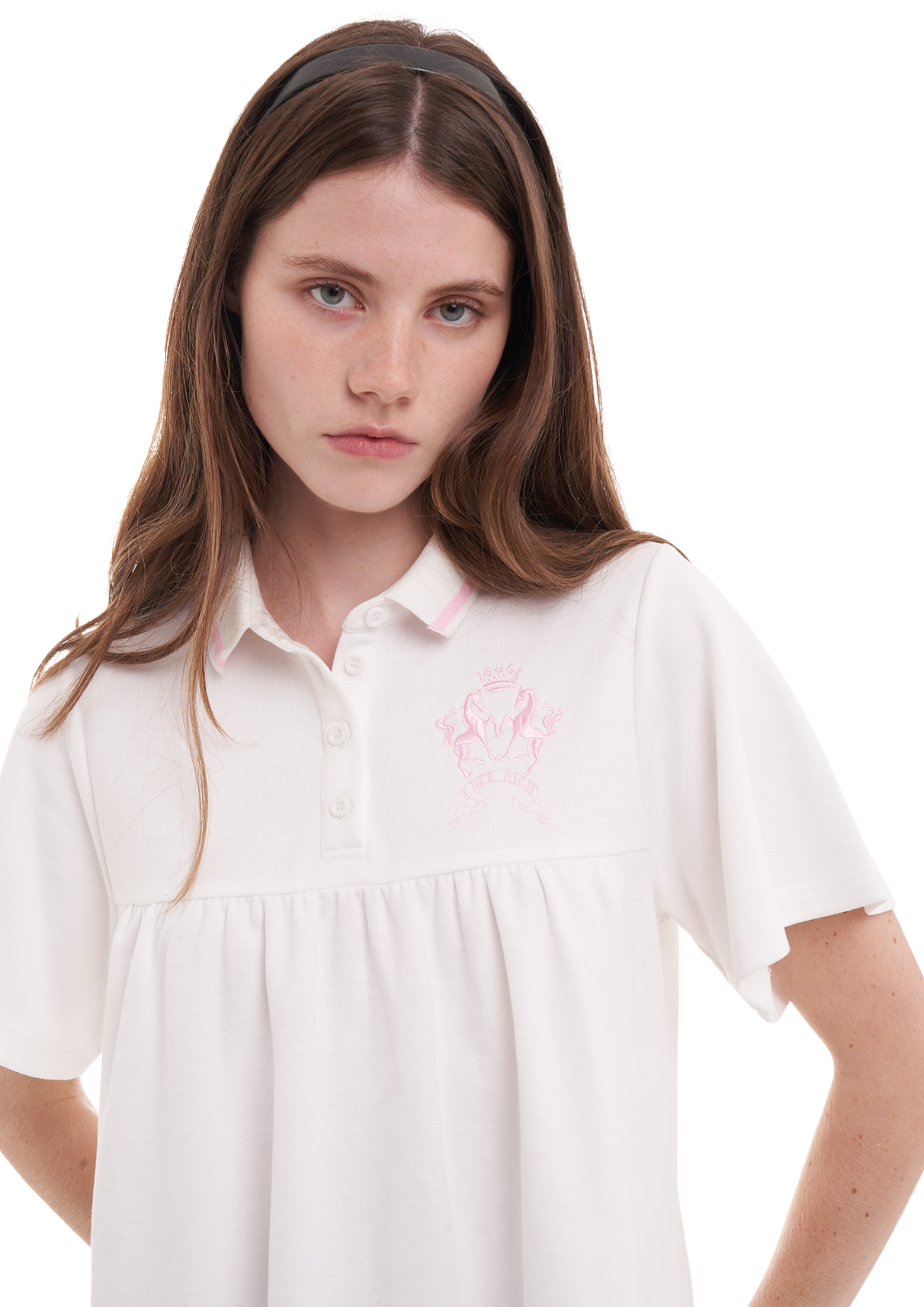 WHITE PEPLUM RELAXED POLO SHIRT WITH EMBROIDERED ‘KNEE HIGH’ CREST EMBROIDERED ON LEFT CHEST IN BABY PINK