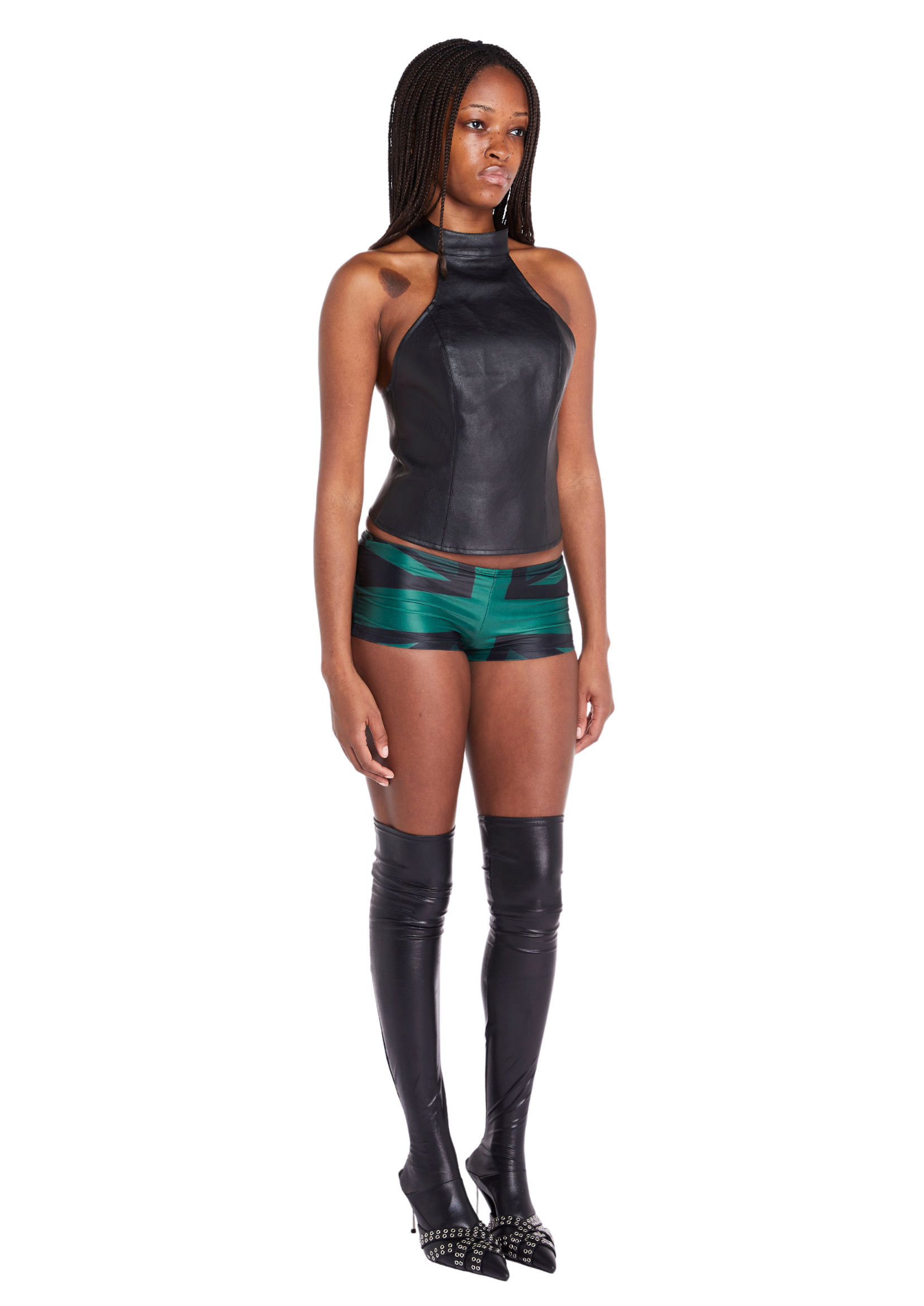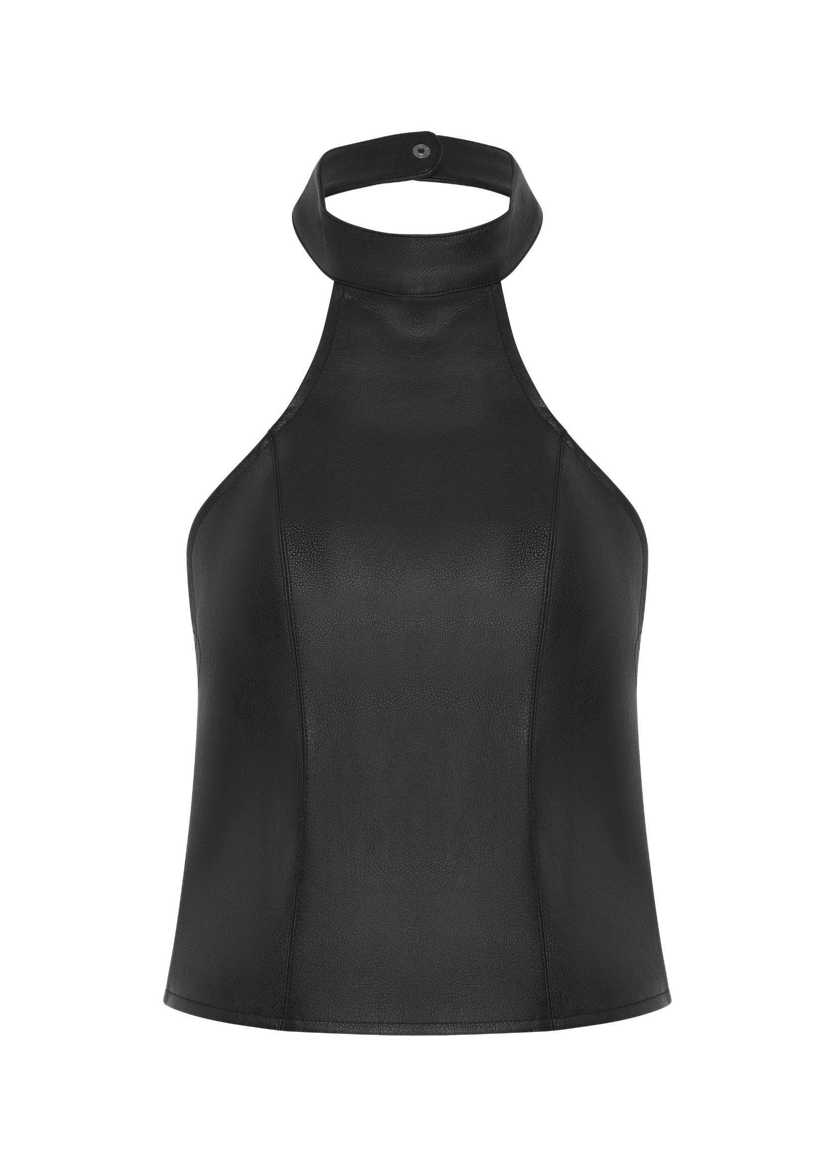 THE MILA TOP IN A SUBTLE TEXTURED BLACK FAUX LEATHER. THIS HIGH NECK HALTER TOP FEATURES A GUNMETAL POPPER CLOSURE AT THE BACK NECK & SUBTLE TOP STITCHING DETAILS ACROSS ALL SEAMS.