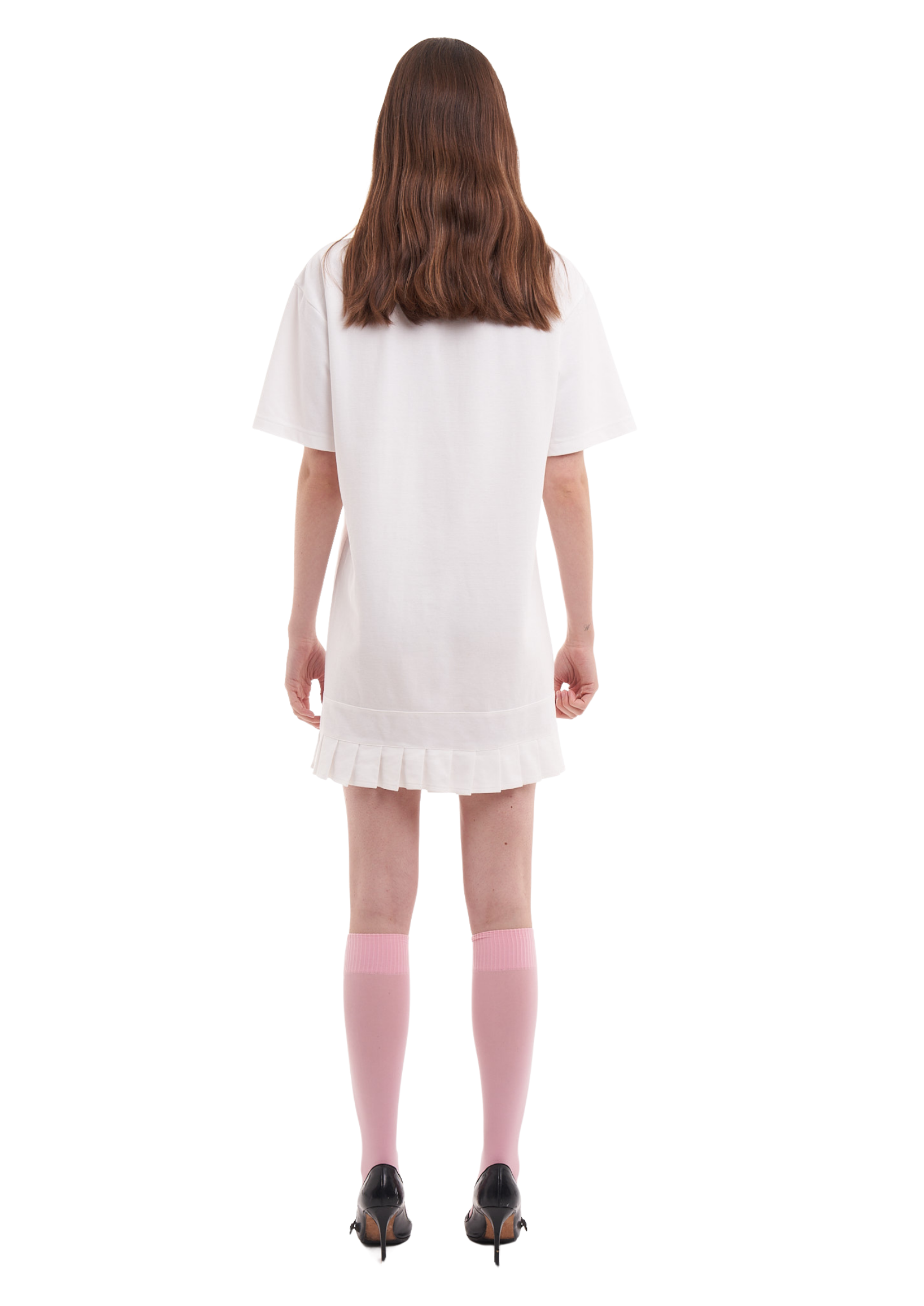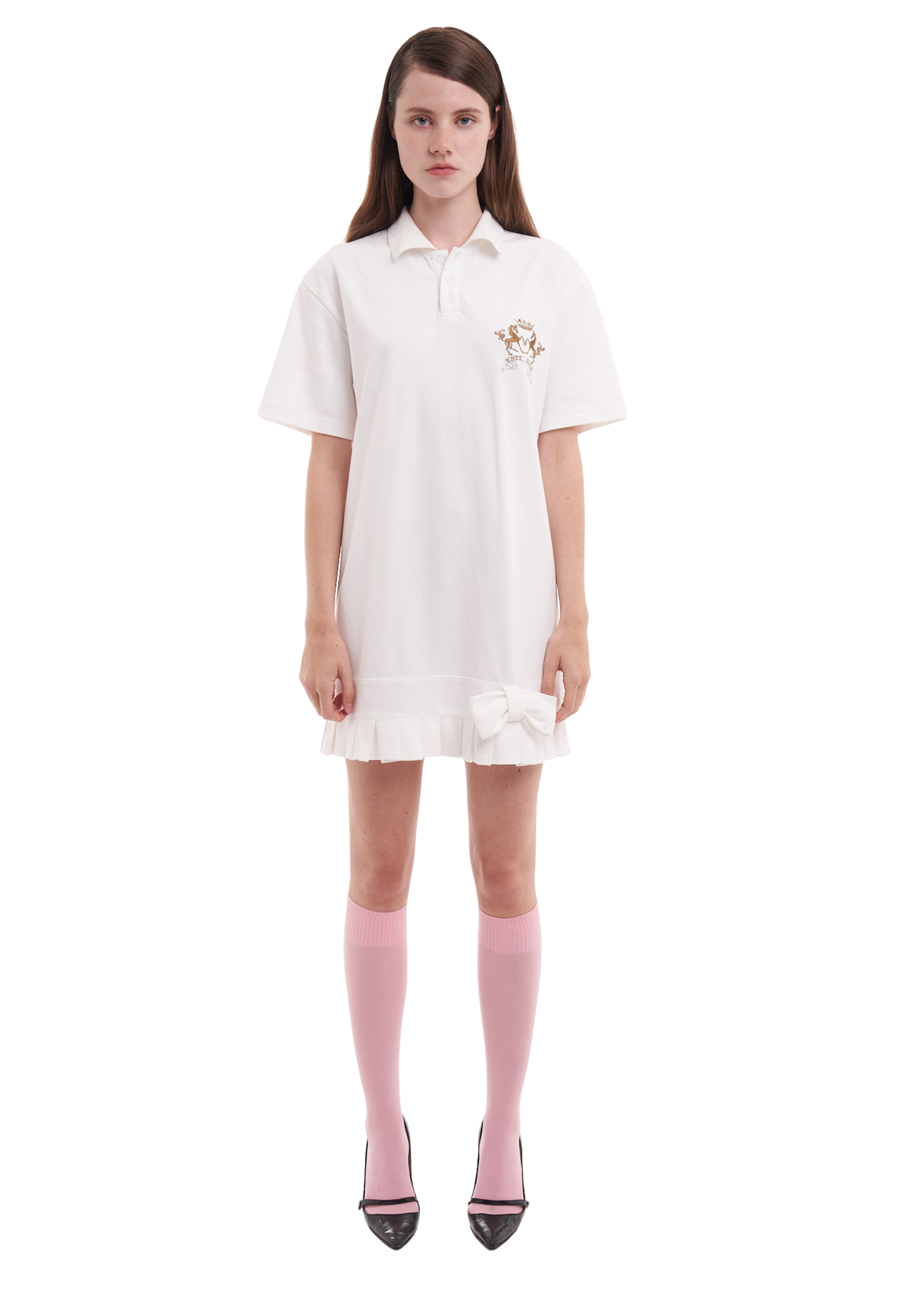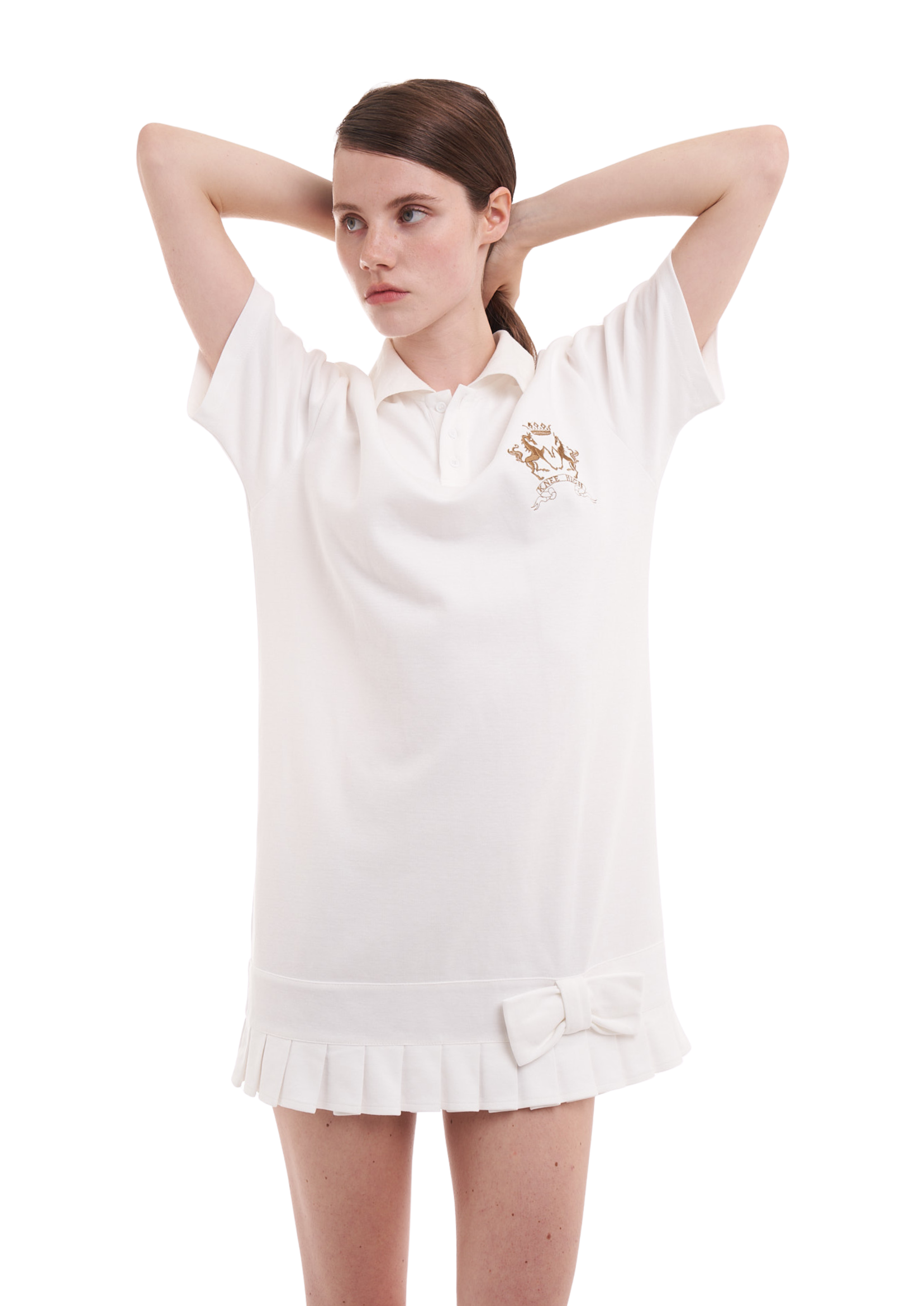 OVERSIZED POLO DRESS WITH PLEATED SKIRT HEM. FEATURING OUR 'KNEE HIGH' EMBROIDERED EMBLEM, BOW DETAILING & BOXY FIT