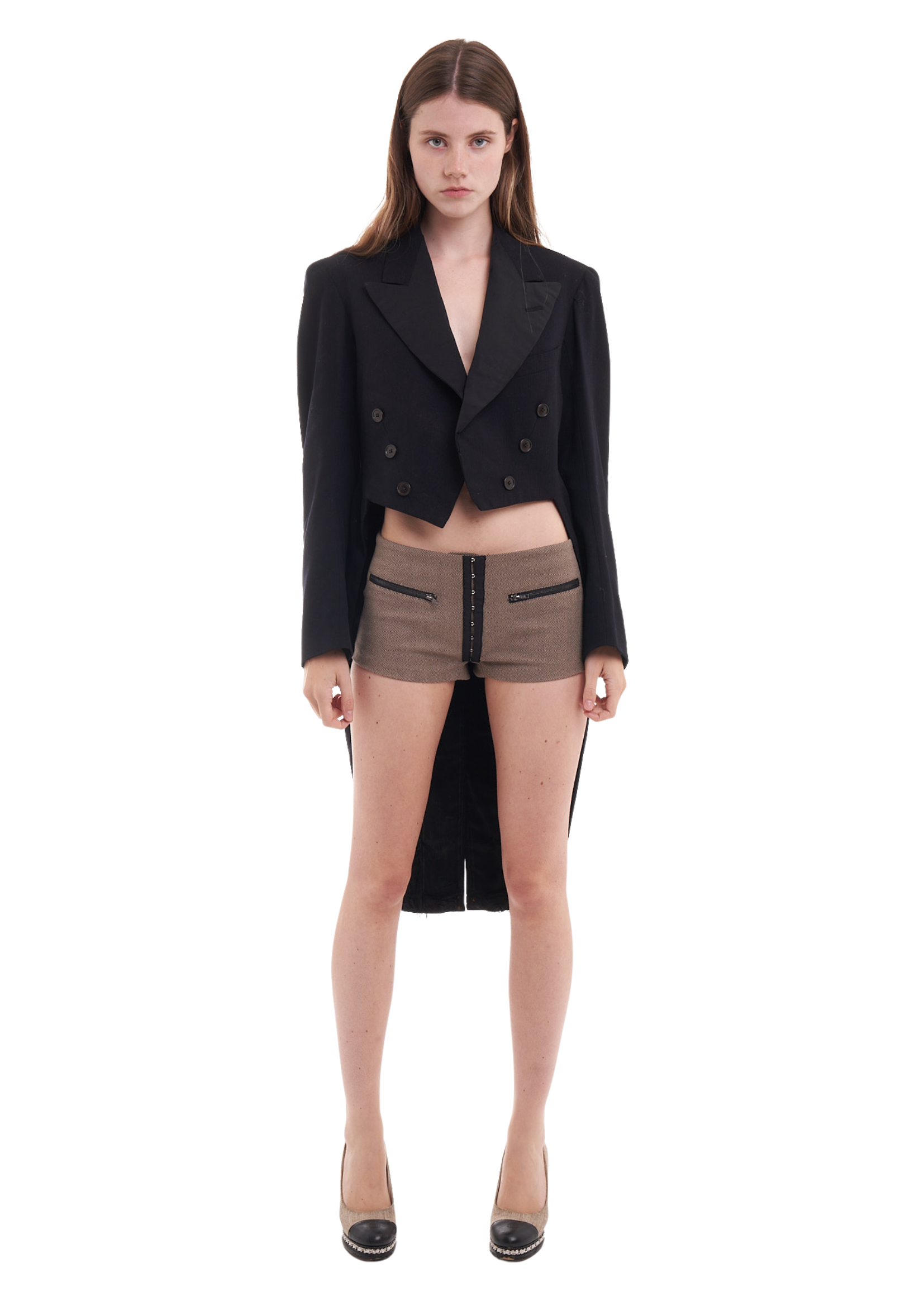 LOW WAIST MICRO BOOTY SHORTS IN VINTAGE BROWN TWILL. FEATURING A HOOK & EYE FLY & TWO ZIP FAUX POCKETS