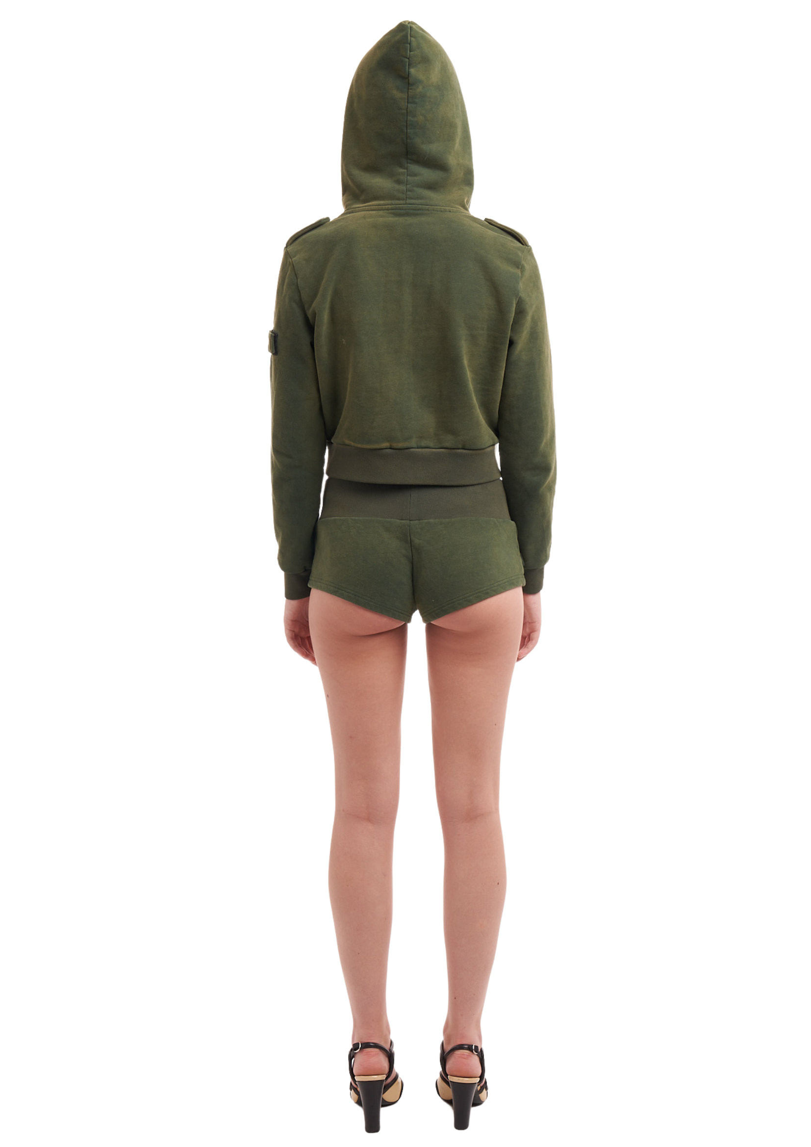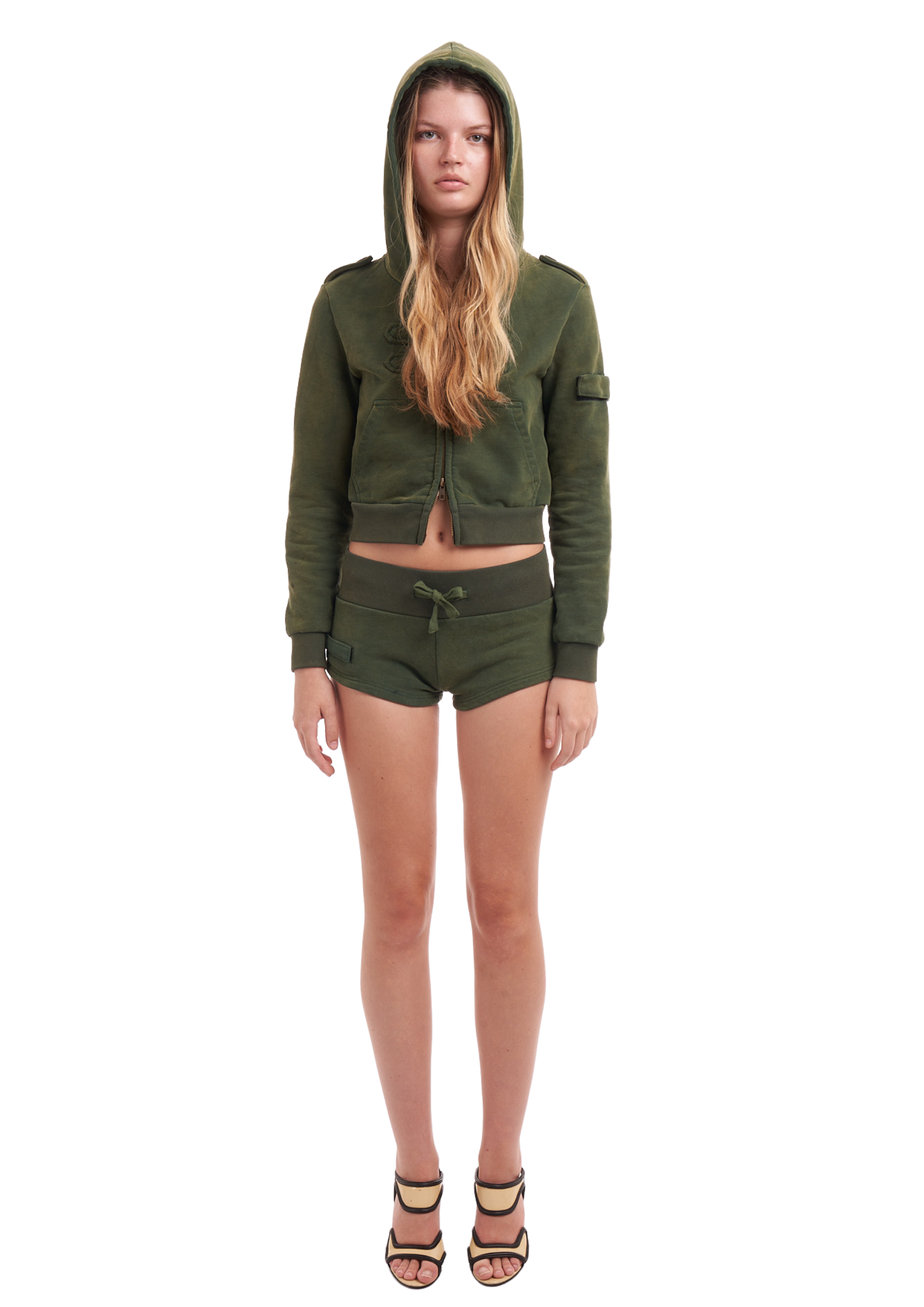 MICRO BOOTY SHORTS IN KHAKI. FEATURING THICK WAISTBAND, CORD WAIST TIE & VELCRO STRAP DETAIL