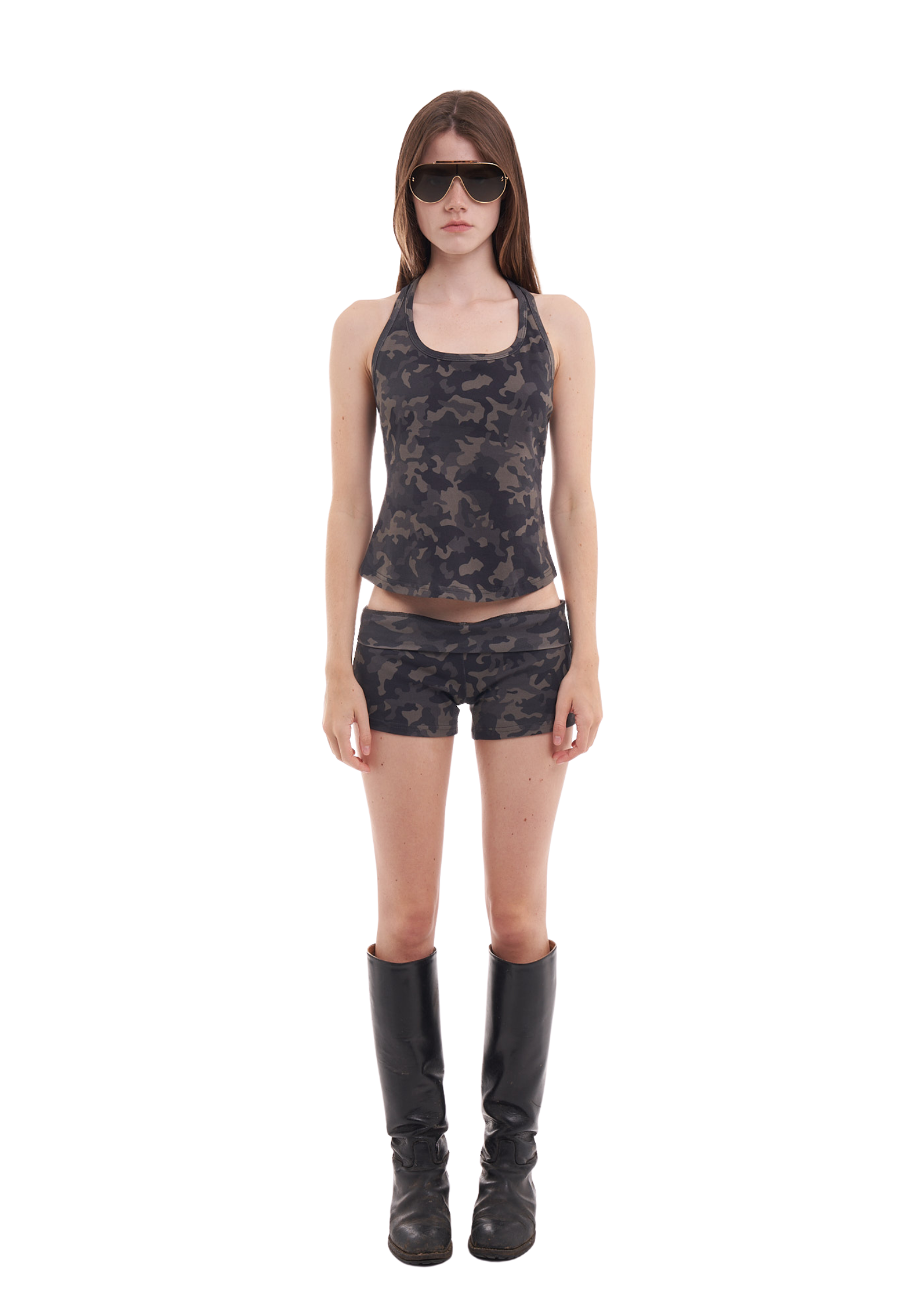 LOOSE FIT COTTON VEST IN WORN OUT CAMO PRINT. ‘KNEE HIGH’ LOGO PRINTED ON THE CENTRE BACK